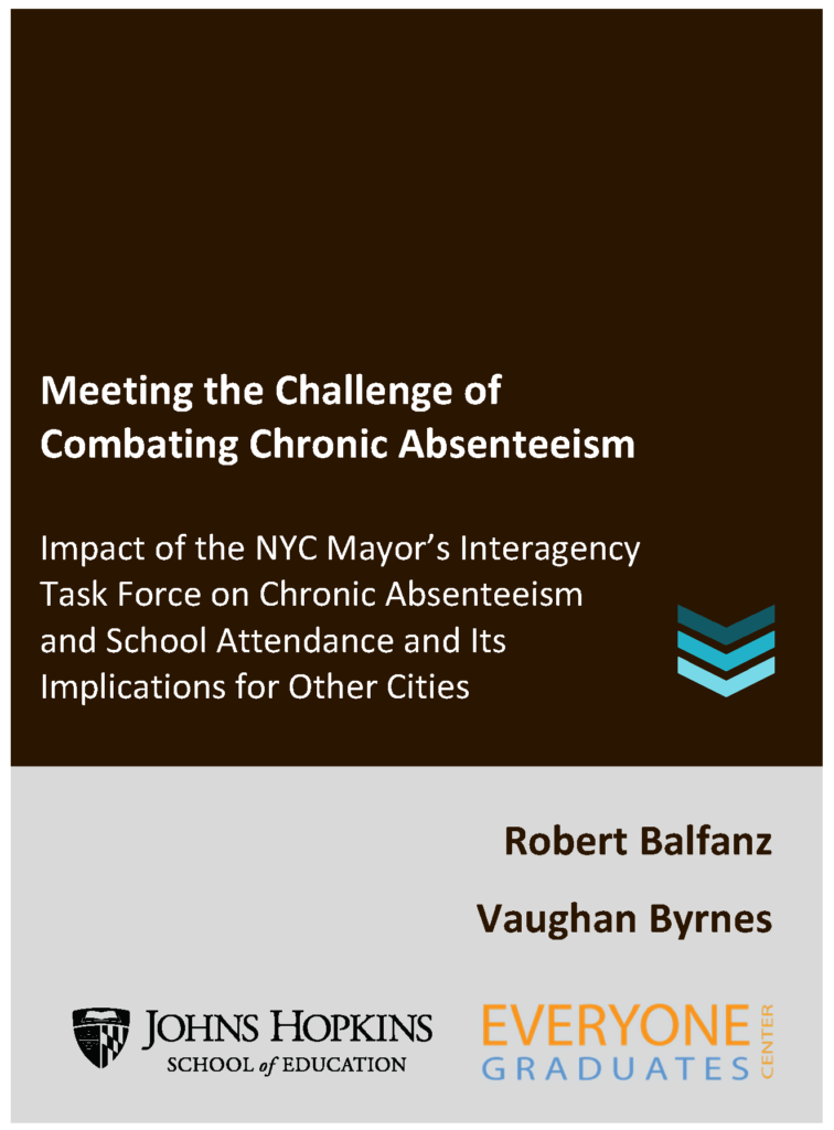 Meeting the Challenge of Combating Chronic Absenteeism from the Everyone Graduates Center at Johns Hopkins University School of Education examines the extent and nature of chronic absenteeism in New York City in schools with above‐average rates of chronic absenteeism which were the focus of the task force’s efforts. It investigates the impact of entering and exiting chronic absenteeism on academic outcomes. Finally, it examines the impact of the task force’s chronic absenteeism prevention and intervention programs on reducing chronic absenteeism and increasing school attendance – and what that means for other cities. Download the Report (PDF)