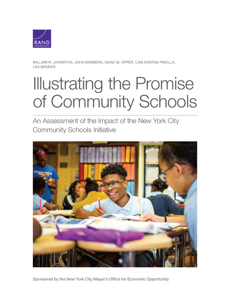 Illustrating the Promise of Community Schools-An Assessment of the Impact of the New York City Community Schools Initiative With the launch of the New York City Community Schools Initiative (NYC-CS) in 2014, the New York City Department of Education (NYCDOE) has increased its focus on the implementation of a holistic strategy of education reform to address the social consequences of poverty as a means to improving student outcomes. NYC-CS is a strategy to organize resources in schools and share leadership among stakeholders so that academics, health and wellness, youth development, and family engagement are integrated into the fabric of each school. Download the Report (PDF)