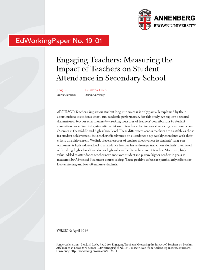 Engaging Teachers: Measuring the Impact of Teachers on Student Attendance in Secondary School Teachers’ impact on student long-run success is only partially explained by their contributions to students’ short-run academic performance. For this study, we explore a second dimension of teacher effectiveness by creating measures of teachers’ contributions to student class-attendance.