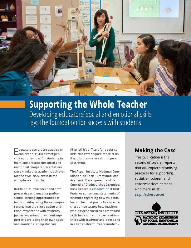 Supporting the Whole Teacher from The Aspen Institute highlights the need for teacher preparation and professional learning to both build teachers’ own social and emotional competence and prepare teachers to foster these skills in their students. The case study cites key examples of programs supporting teachers in this work including RULER, an evidence-based program that trains teachers on how to model the social and emotional behaviors they want to see in their students, and the Center for Reaching and Teaching the Whole Child, which works with teacher preparation programs to help integrate teacher and student social and emotional competencies into their classes. Download the Report (PDF)