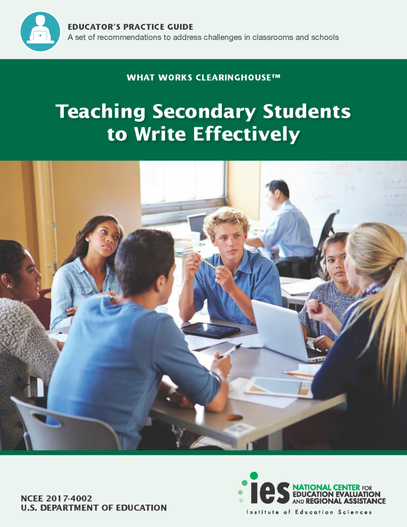 Teaching Secondary Students to Write Effectively from the Institute of Education Sciences offers educators specific, evidence-based recommendations that address the challenges of teaching students in grades 6–12 to write effectively. This guide synthesizes the best publicly available research and shares practices that are supported by evi-dence. It is intended to be practical and easy for teachers to use. Download the Report (PDF)