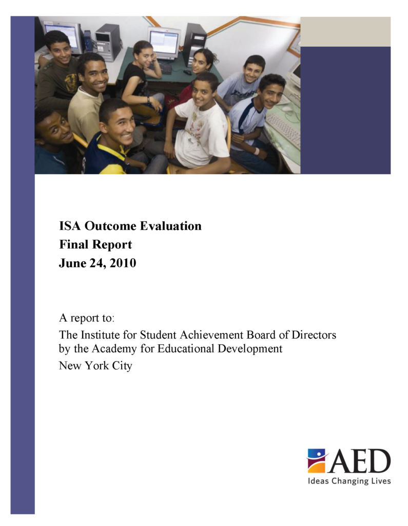 ISA Outcome Evaluation This report summarizes key findings from Academy for Educational Development’s external evaluation of the Institute for Student Achievement (ISA). The six-year evaluation investigated the following key questions: 1) What are the outcomes for ISA students in terms of high school and college achievement?, and 2), How do outcomes for ISA students compare with those of similar students in non-ISA schools?