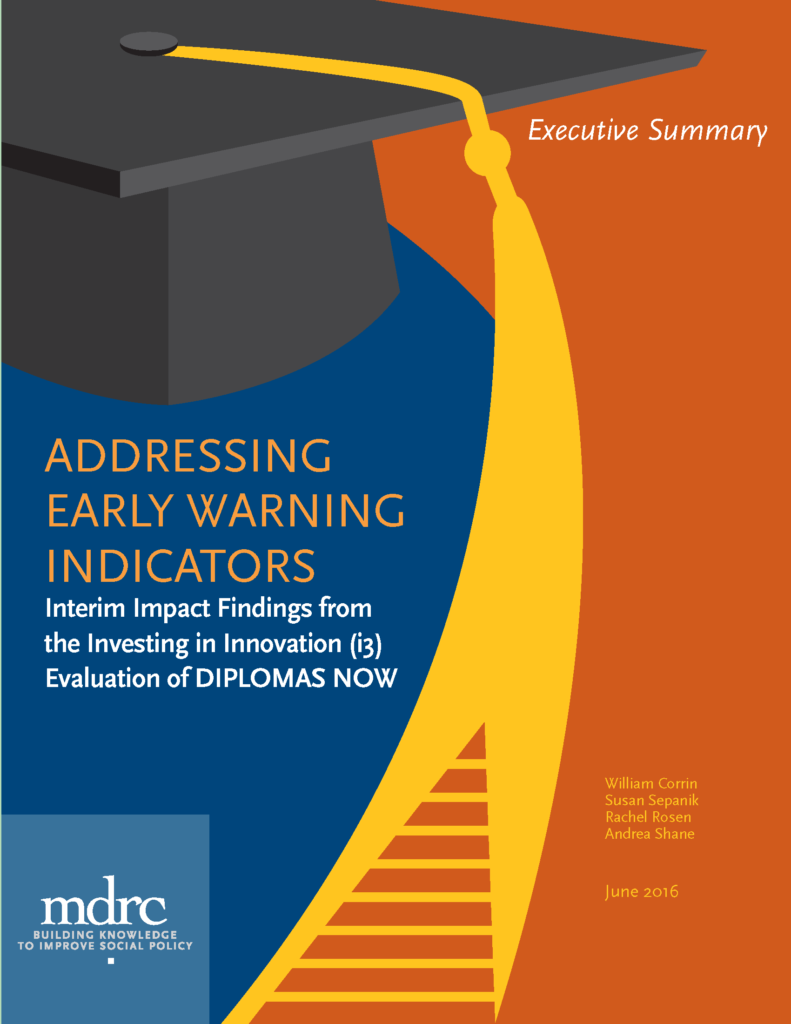 Addressing Early Warning Indicators: Interim Impact Findings from the Investing in Innovation (i3) Evaluation of Diplomas Now from MDRC and ICF International which conducted an independent, experimental evaluation of 62 secondary schools in 11 school districts on the impact and implementation of Diplomas Now.