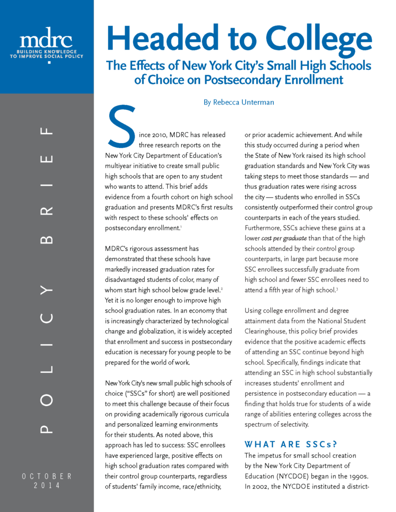 Headed to College: The Effects of New York City’s Small High Schools of Choice on Postsecondary Enrollment Since 2010, MDRC has released three research reports on the New York City Department of Education’s multi-year initiative to create small public high schools that are open to any student who wants to attend. This brief adds evidence from a fourth cohort on high school graduation and presents MDRC’s first results with respect to these schools’ effects on postsecondary enrollment.