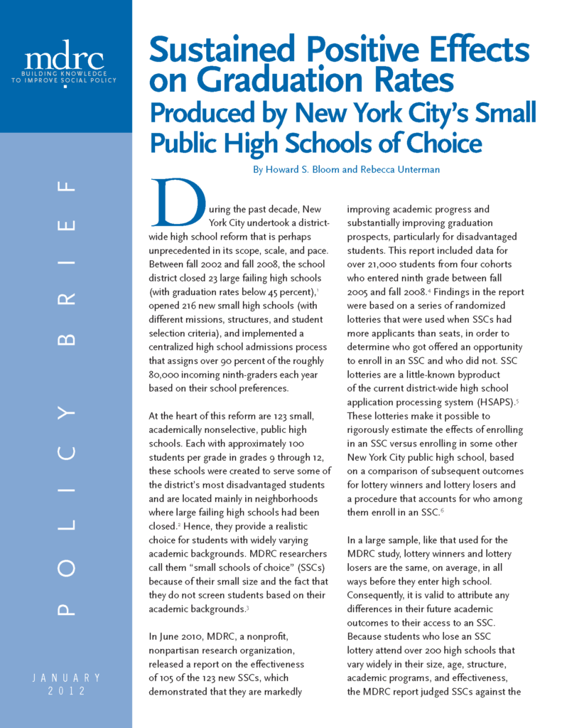 Small High Schools and Student Achievement: Lottery-Based Evidence from New York City This detailed report shows results of more than 150 unselective small high schools created between 2002 and 2008 have enhanced autonomy, but operate within-district with traditional public school teachers, principals, and collectively-bargained work rules. Lottery estimates show positive score gains in mathematics, English, science, and history, more credit accumulation, and higher graduation rates.